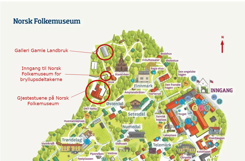 Etter vielsen blir det kake, fingermat og mingling utenfor Gjestestuene på Norsk folkemuseum, ca 200 meter unna vielseslokalet.