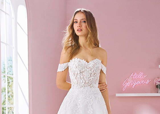 Vi har salg av brudekjoler, selskapskjoler og stort utvalg i herreklær.